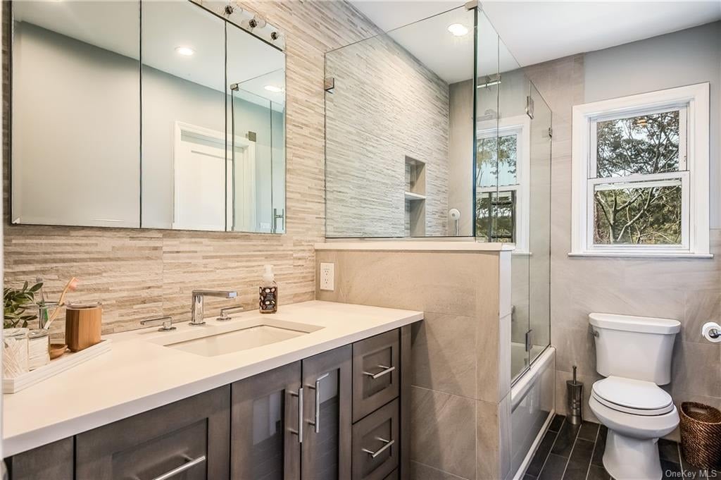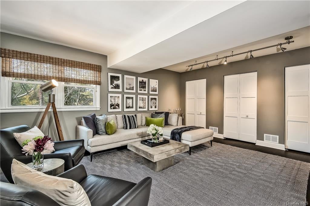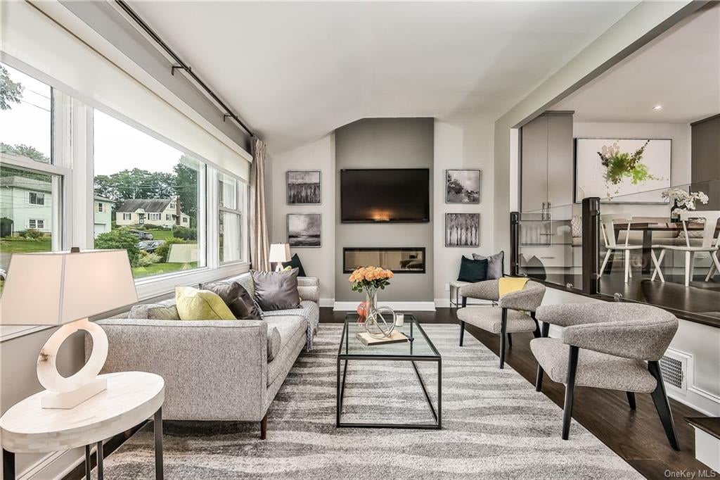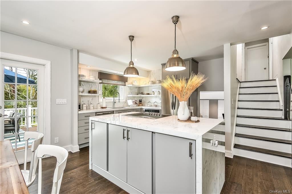 Welcome to this Fully Renovated 3 Bedroom, 1.5 Bath Split Level home. Designed in part by the HGTV Property Brothers. Formal Living Room with 9' Ceilings and wall mounted Electric Fireplace. Gorgeous Eat in Kitchen with Marble Waterfall Center Island and French Door access to the Multi level Deck. The first floor also includes a Powder Room and a Family room with access to the the 1 car garage. The second floor includes Master Bedroom with a Dressing area and a large Closet, Hall Bath with additional access to the Master Bedroom and 2 additional Family Bedrooms. Walkout Lower level includes Laundry Area and a Recreation room with a Slider to the Covered Patio, Level Property & Fire Pit with seating area.